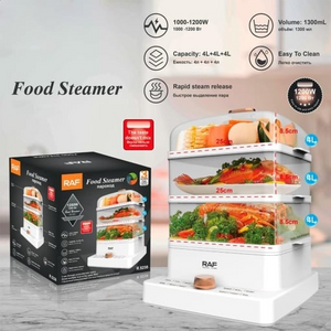 Aparat electric pentru gatit cu aburi, RAF R5238, putere 1200W incalzire rapida, cu 3 niveluri, 3 x 4L, 1300ml Volum, capacitate mare gătire simultana pentru legume, carne sau cereale, inchidere automata si protectie antiuscare, plastic+ PP, 38x28x29 cm, alb