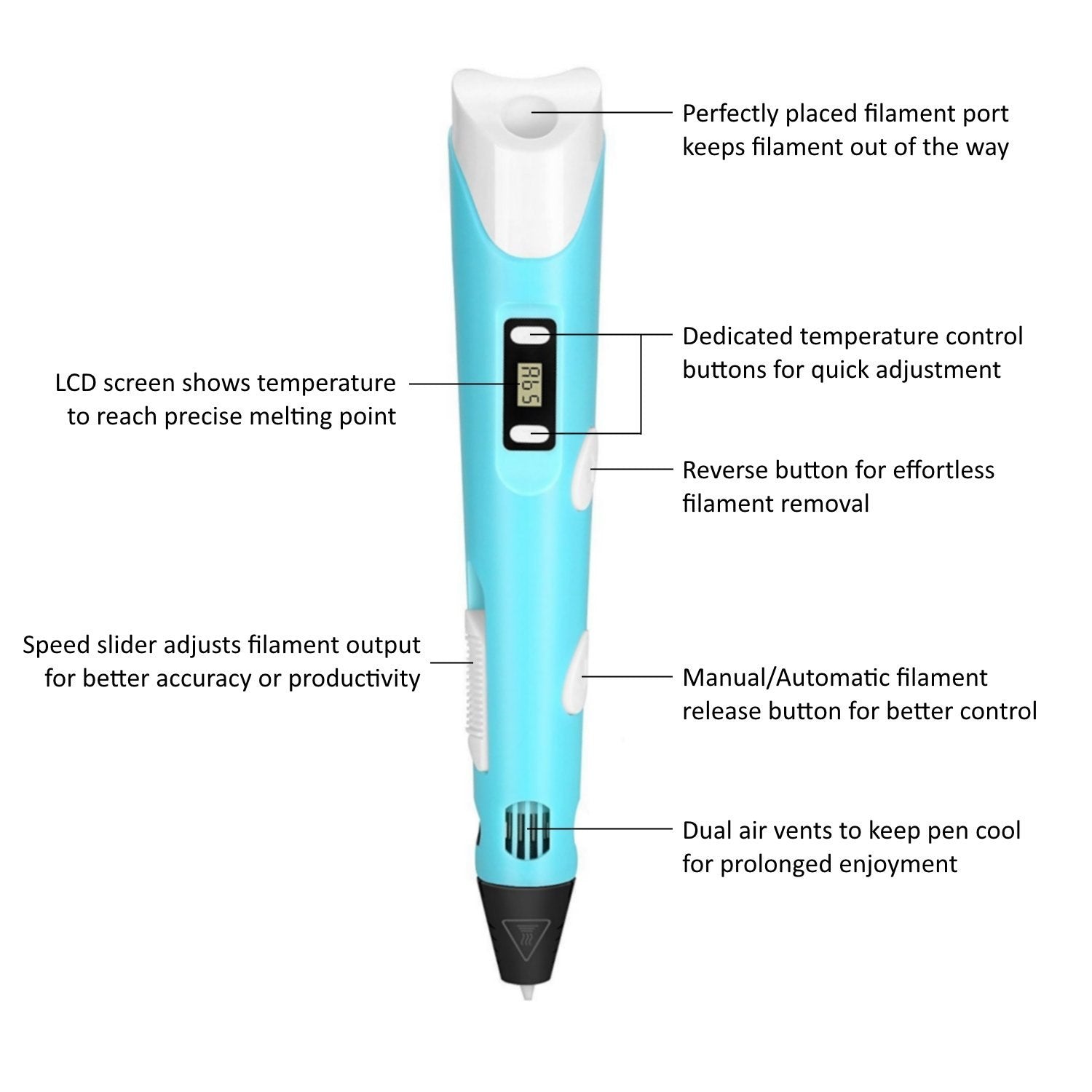 Cu ajutorul creionului 3D, puteti desena in spatiu, realizand astfel obiecte 3D. Are un design ergonomic pentru a fi folosit cu usurinta in timpul desenarii. In pachet sunt incluse 4 filamente cu culori diferite, iar acestea pot fi schimbate cu usurinta apasand doar un buton. Modelul prezentat are afisaj electronic care indica temperatura. Lasati aparatul sa ajunga la temperatura optima si incepeti sa desenati in spatiu!