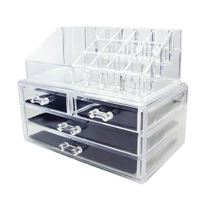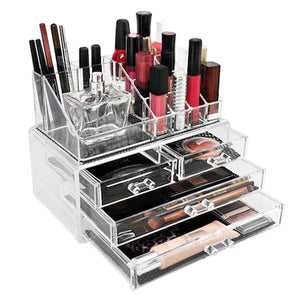 Cutia pentru cosmetice dispune de un design inovativ, aceasta este realizată din acrilat transparent rezistent și beneziciază de 4 sertare plus alte peste 17 suporturi speciale pentru rujuri, creme, oje sau alte accesorii.