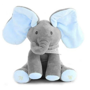 Un elefant de plus adorabil cu doua moduri de joc diferite. Apasati pe piciorul stang pentru a juca un joc interactiv de peek-a-boo si dreptul pentru a auzi melodia „Fa-ti urechile sa stea jos” cu vocea unui copil dragut. Urechile se misca si se apleaca in timpul jocului.