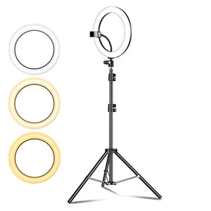 Lampa circulara LED Ring Light, lumina calda/rece/neutra, telecomanda pe fir, suport telefon, trepied 210cm