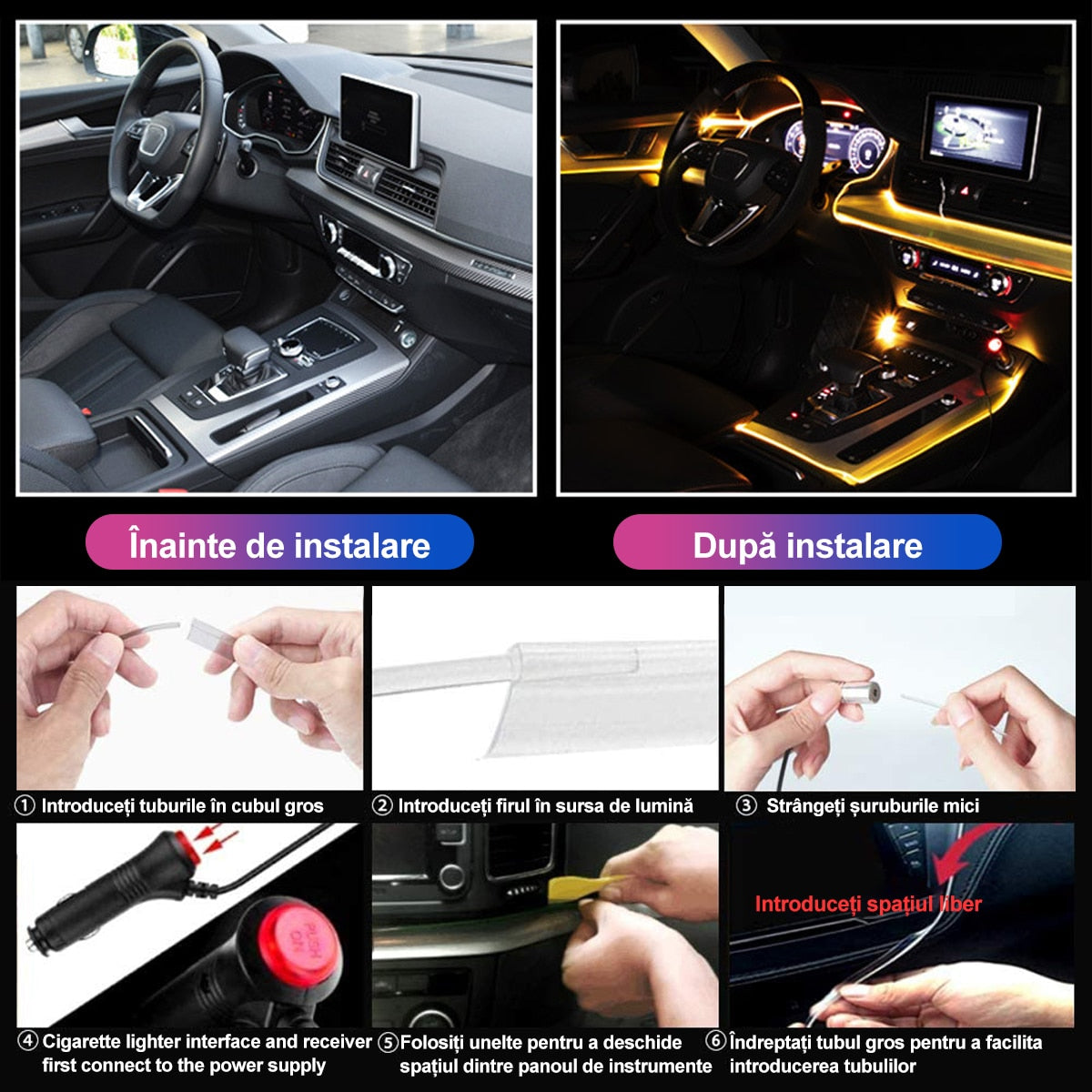 Lumina LED flexibila, rezistenta la apa, care poate fi instalata cu usurinta sub bord sau sub scaun, potrivita pentru decorarea si accesoriile auto. Banda luminoasa din masina este incarcata cu o bricheta si este, de asemenea, protejata impotriva scurtcircuitelor.
