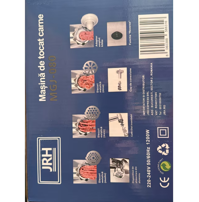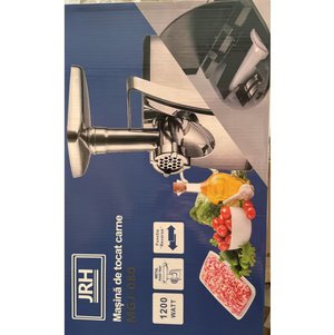 Masina de tocat jrh beneficiaza de o putere de 1200W. Aceasta poate toca pana la 1,5 kg de carne pe minut. Aceasta are functie de revers. In pachetul produsului se regasesc doua site ( de 5mm si 7mm ), lama din otel inoxidabil si o bara de plastic cu ajutorul careia puteti pune presiune.