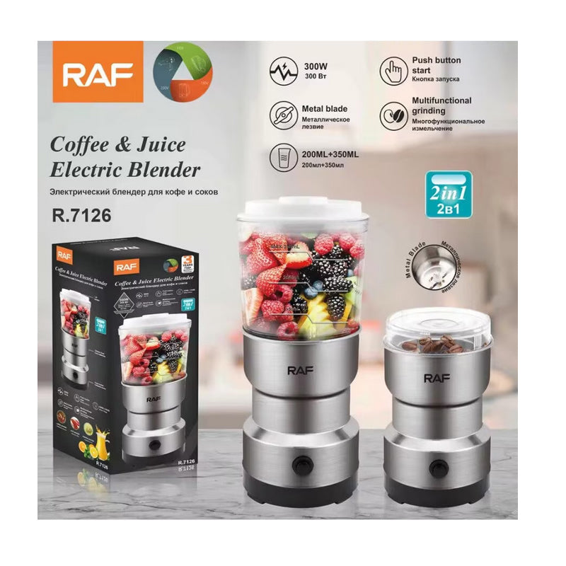 Rasnita electrica si blender 2 in 1 RAF 7126, 300W, capacitate 200 si 350ml, din plastic si inox, argintiu. Datorita rasnitei-blenderului de cafea RAF R-7126, vei putea macina boabele de cafea in cateva minute pentru prepararea ulterioara a cafelei aromate sau a sucului.
