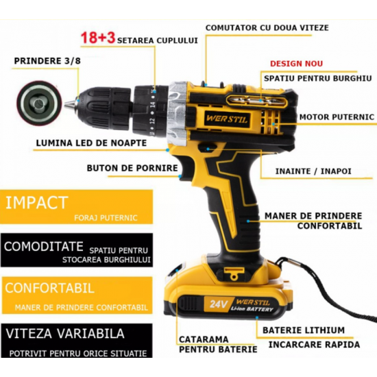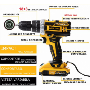 Putere Impresionantă: Cu un sistem de alimentare de 24V și două acumulatori puternici de 5Ah, această bormașină dispune de o putere semnificativă pentru a efectua sarcini grele. Această putere este ideală pentru lucrările de foraj în lemn, metal sau beton.